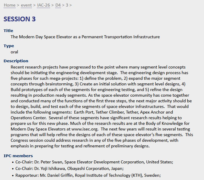 4:30 – 4:40 Reassessing the requirements for a relevant space elevator : Steven Griggs