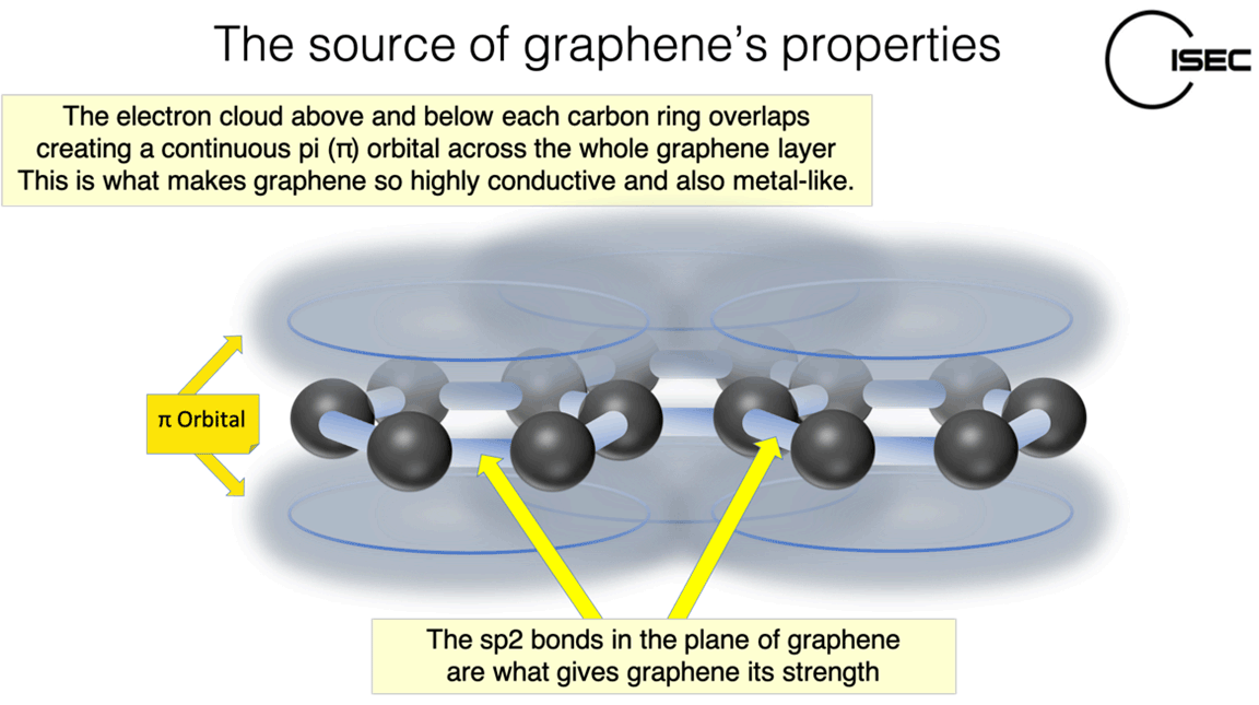 [Note: This paragraph corrects an error in the emailed version of the newsletter.] We know that graphene has an electron cloud called a pi (π) orbital above and below the plane of the rings. When photons arrive at this surface, they encounter the electrons. Some absorb these photons promoting the electrons to a higher energy level. When the electrons drop back down to a lower energy level, the phtons are re-emitted, and this is what creates the characteristic metallic appearance.