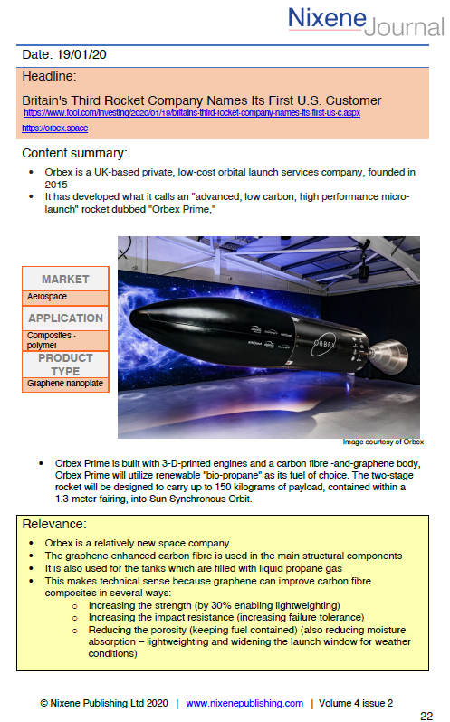 This is an extract from the journal about the Orbex space company with their graphene enchanced carbon fibre launch vehicle.