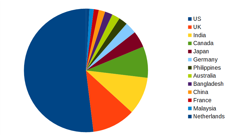 The chart below shows the result of combining the two data sources with equal weighting. You can see that by far the greatest interest is from the US, but it may surprise some that India is competing with the UK and Canada for second place.