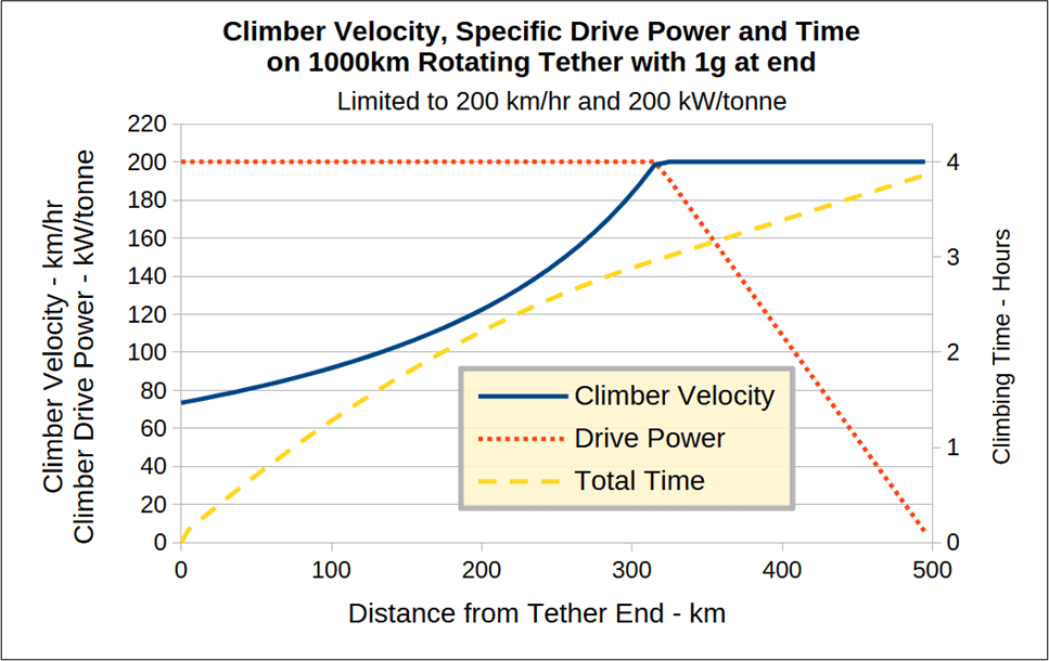 The climber could have a similar initial power (200kW/t) and climb speed as on an Earth SE, with the speed increasing more rapidly to 200 km/hr after just 330 km and 3 hours of climbing. At this point the drive power would reduce to limit the speed to 200 km/hr, falling rapidly to zero as the climber approaches the tether mid-point after another 0.9 hours.