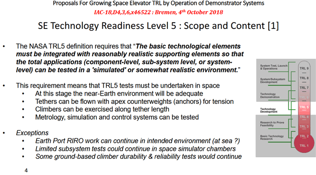 [6] Peter Robinson: Presentation at October-2018 IAC conference, Bremen (IAC-18-D4.3,6,x46522): “Proposals For Growing Space Elevator TRL by Operation of Demonstrator Systems”. (Paper: IAF copyright, not available on any public website, available to ISEC members in Zotero library)