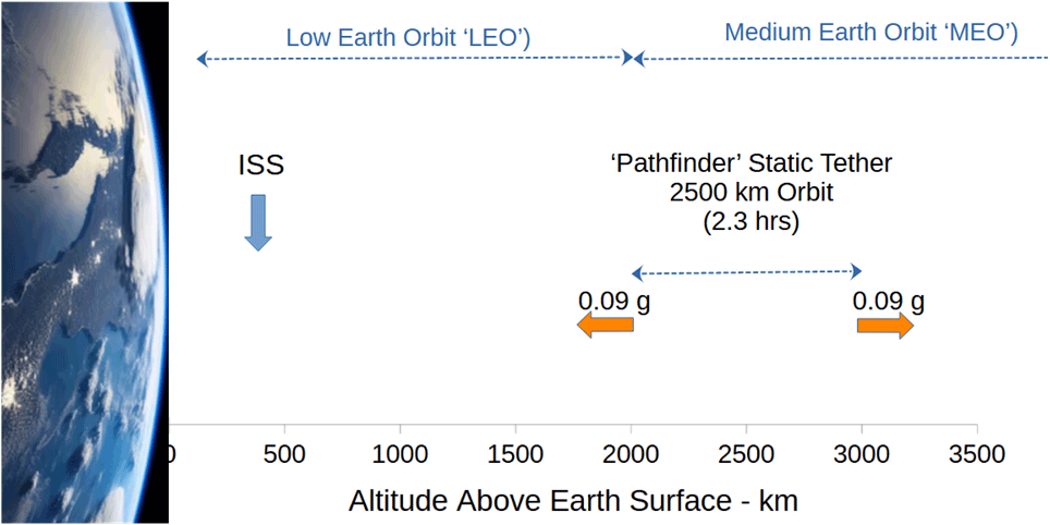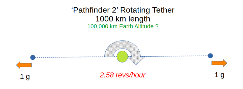 The two potential multi-purpose “Pathfinder” test case examples both use 1000km tethers: one non-rotating in Medium Earth Orbit (MEO) and the other rotating at perhaps 100,000km Earth altitude, depicted in Figures 3 and 4 below.