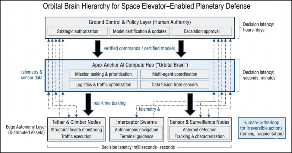 Conventional planetary defense architectures will continue to face limitations arising from their dependence on ground-based detection systems and rocket-launched interceptors. These systems are constrained by launch readiness, limited deployment frequency, and lengthy decision-making cycles. This paper will present a conceptual framework for an AI-driven control system located at the Space Elevator’s Apex Hub, offering a transformative alternative to traditional, Earth-bound defense systems. The Apex Hub, positioned in geostationary orbit, will function as a permanent, powered, and logistically connected command node for planetary defense. Its stationary position relative to Earth will enable continuous line-of-sight coverage over vast regions of space, minimize communication latency, and allow the pre-positioning and maintenance of interceptor assets without the recurring cost or delay associated with launch vehicles. This architecture will shift planetary defense from a reactive, launch-based model to a proactive, pre-deployed defense posture capable of immediate response. Artificial Intelligence will serve as the core enabler of autonomy within this system. AI algorithms will fuse multi-source sensor data, predict the trajectories of potential threats, prioritize risks, and coordinate multiple interceptor units simultaneously. The integration of AI will enable the Apex Hub to make rapid, independent, and reliable decisions in real time, even under degraded communication conditions or during high-threat situations. By combining the Space Elevator’s persistent orbital infrastructure with AI-enabled decision systems, this approach will offer significantly faster response times, greater operational availability, and reduced long-term costs compared to conventional planetary defense architectures. The proposed system will represent a strategic evolution toward a continuous, intelligent, and sustainable defense paradigm, enhancing Earth’s preparedness against near-Earth objects and other extraterrestrial threats.