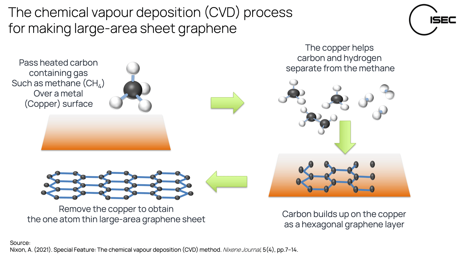 As you will also know, the chemical vapour deposition (CVD) method is the leading process for making large scale sheet graphene. The starting point is a carbon containing gas such as methane. This is heated to around 1000°C degrees centigrade and guided gently over a metal surface, usually copper or nickel. The metal acts as a catalyst removing hydrogen from the carbon. The carbon rapidly self assembles atom-by-atom on the metal surface to form a layer of graphene [1].