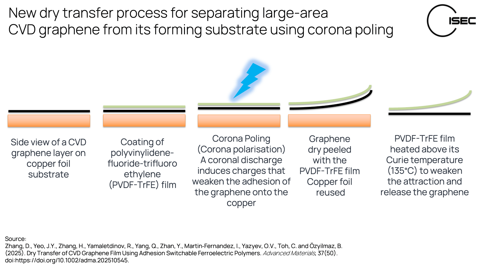 The team is now working on a continuous manufacturing process for this dry transfer process. This corona poling method promises to speed up the manufacturing bottleneck of separating graphene from its substrate without contamination and damage. It will also reduce the cost of production of CVD graphene because the copper foil substrate is being re-used. This work is being developed by the team in Singapore to make monolayer graphene for consumer electronics such as flexible touchscreens.